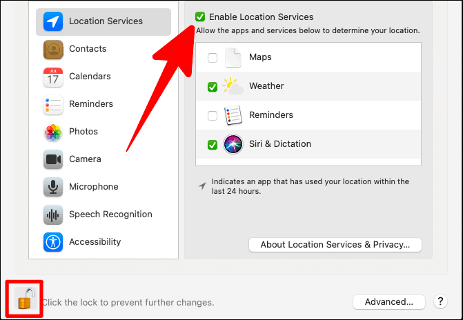 Now, tick the box next to ‘Enable Location Services’. You can tick the apps you want to enable location services for in the box below. Once all that is done, click on the lock icon again to secure your changes.