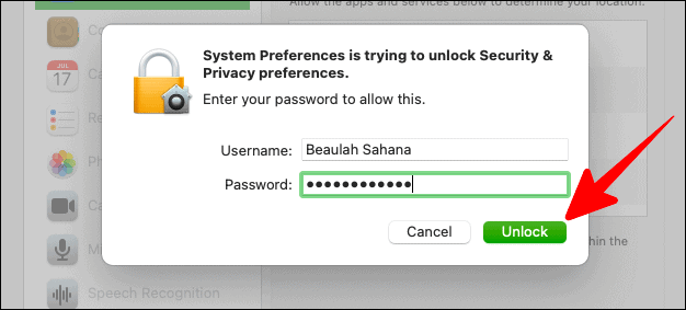 Enter your password in the next prompt box and click on ‘Unlock’ to make changes to your location services.