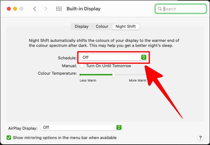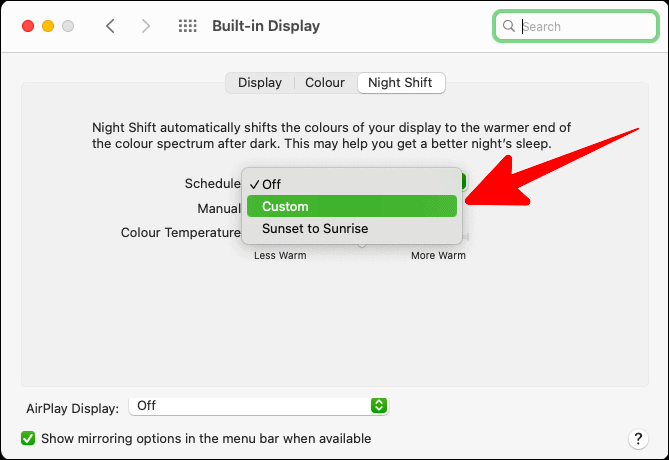 Custom Scheduling: If you want to custom schedule ‘Night Shift’ activation on your Mac, then click on the box next to ‘Schedule’.