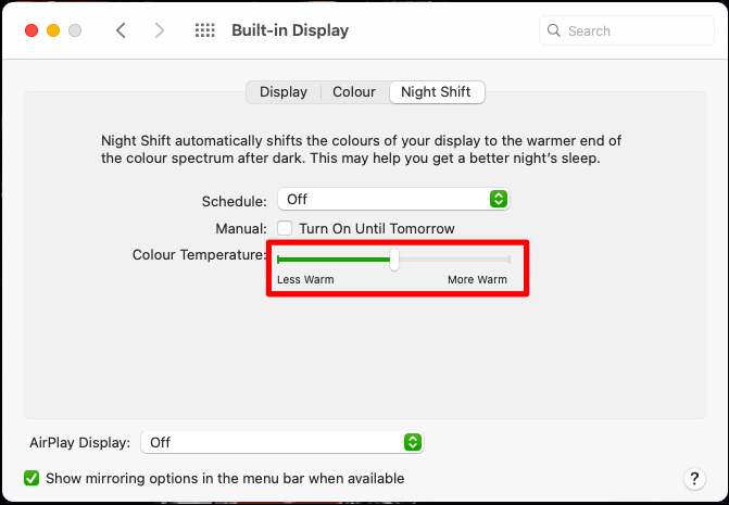 Within the ‘Night Shift’tab, you can customize the color warmth of the night shift between ‘Less Warm’ and ‘More Warm’ by moving the toggle towards the side of your choice.