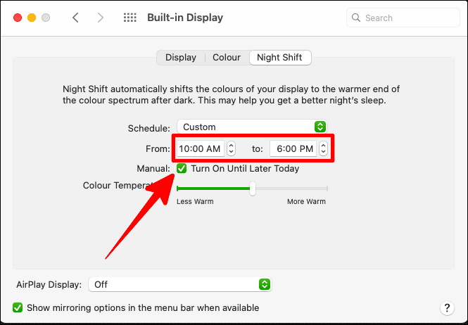 Set the time between which you want the Night Shift to be turned on. Depending on your custom scheduling info, the ‘Manual’ option below would tick itself automatically.