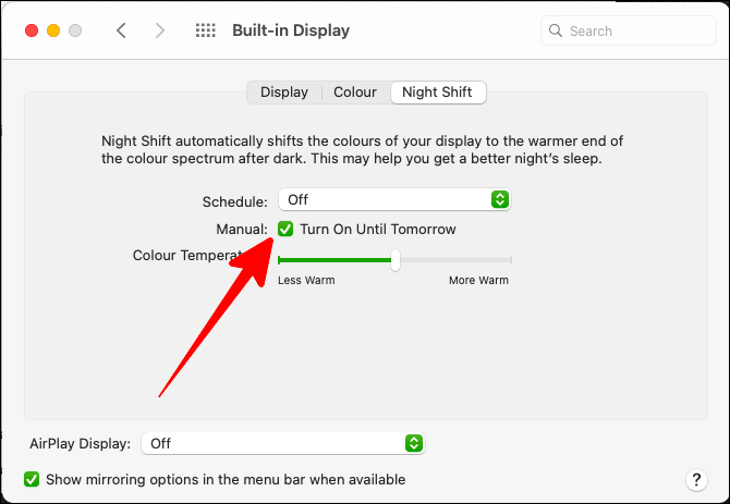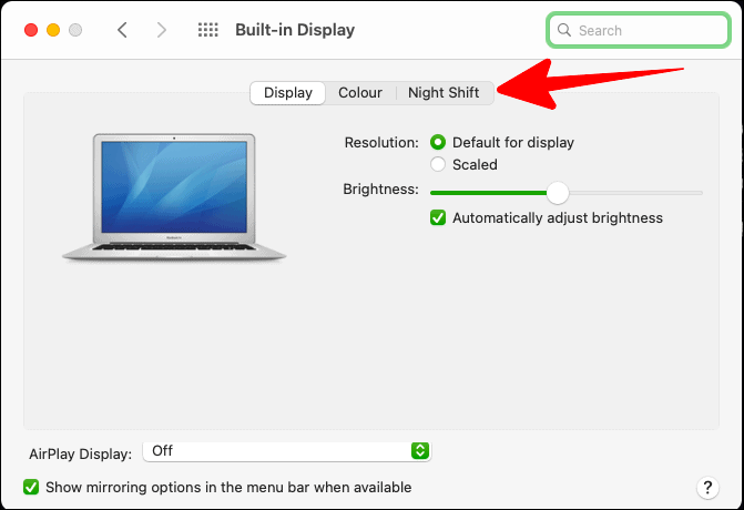 Now, a ‘Built-In Display’ window would appear. Click on the ‘Night Shift’ tab in there.