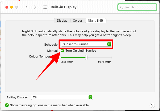 Now, you can easily select ‘Sunset to Sunrise’ as your night shift schedule. But after selecting that option from the drop-down, make sure you also tick the ‘Manual’ box below it to confirm the ‘Sunrise to Sunset’ night shift schedule (it’s not automated for sunset to sunrise scheduling).