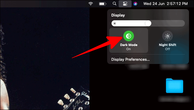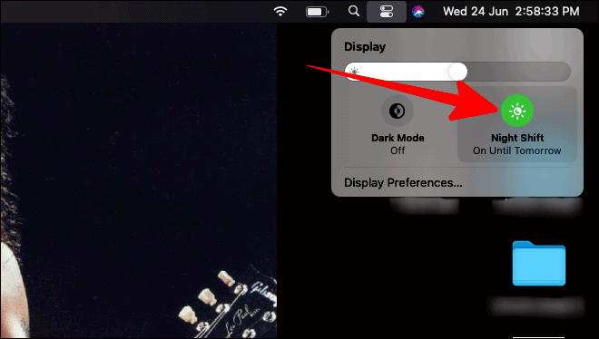 To enable night mode, or in Mac’s language, the ‘Night Shift’, just click on the ‘Night Shift’ icon right next to the ‘Dark Mode’ button.