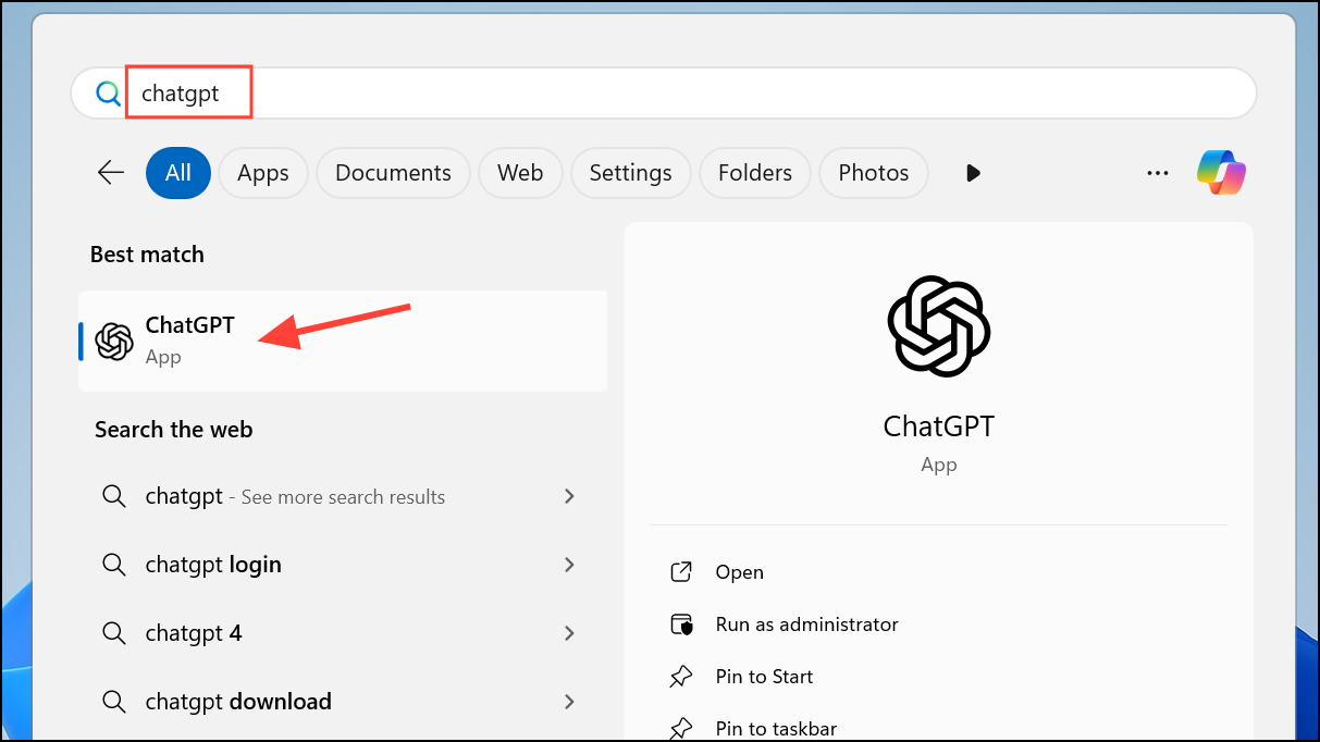 If you prefer installing ChatGPT through command-line tools, you can use Windows Package Manager (winget). Open Command Prompt as administrator and run: