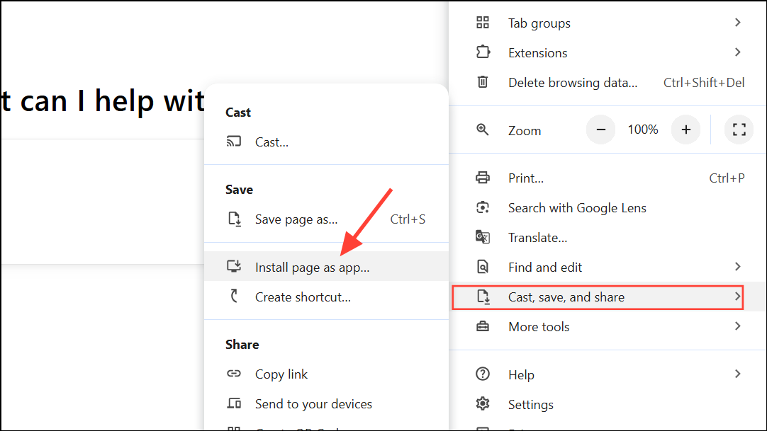 Step 2 (Chrome): Click the three-dot icon, select "Cast, save, and share," then choose "Install pages as app." Confirm the app name and click "Install."