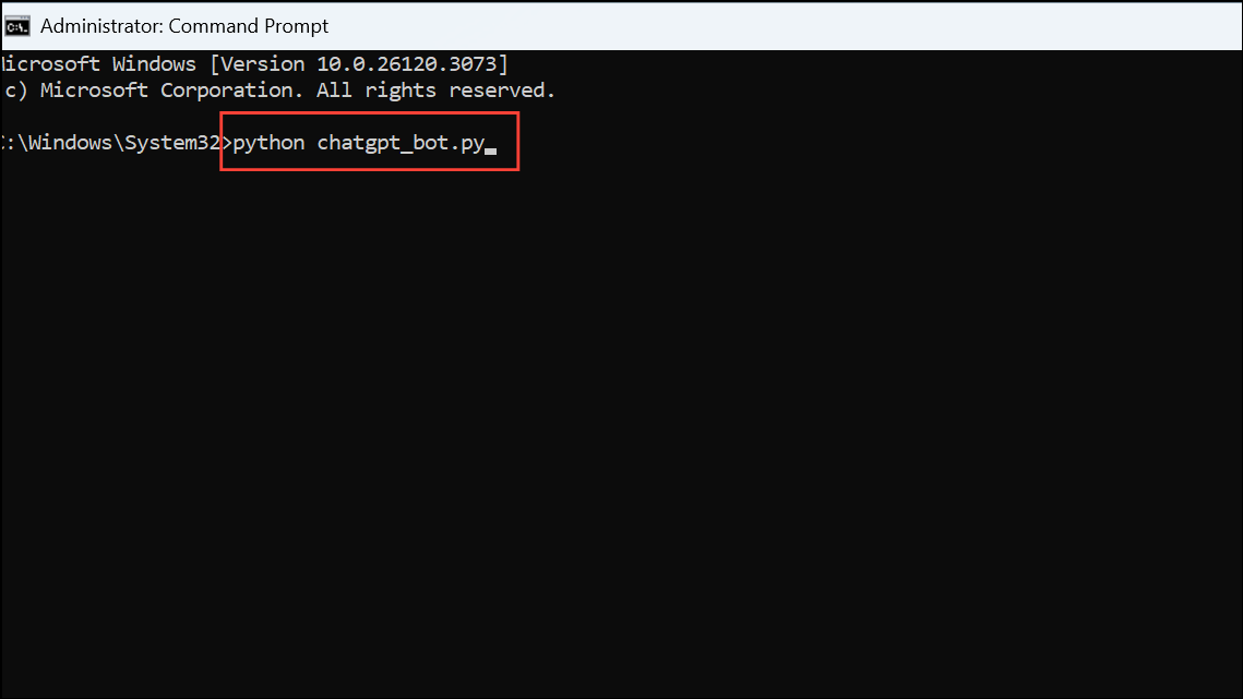 print("ChatGPT:", response)Step 5: Run your script from the Command Prompt by navigating to the script's directory and executing: