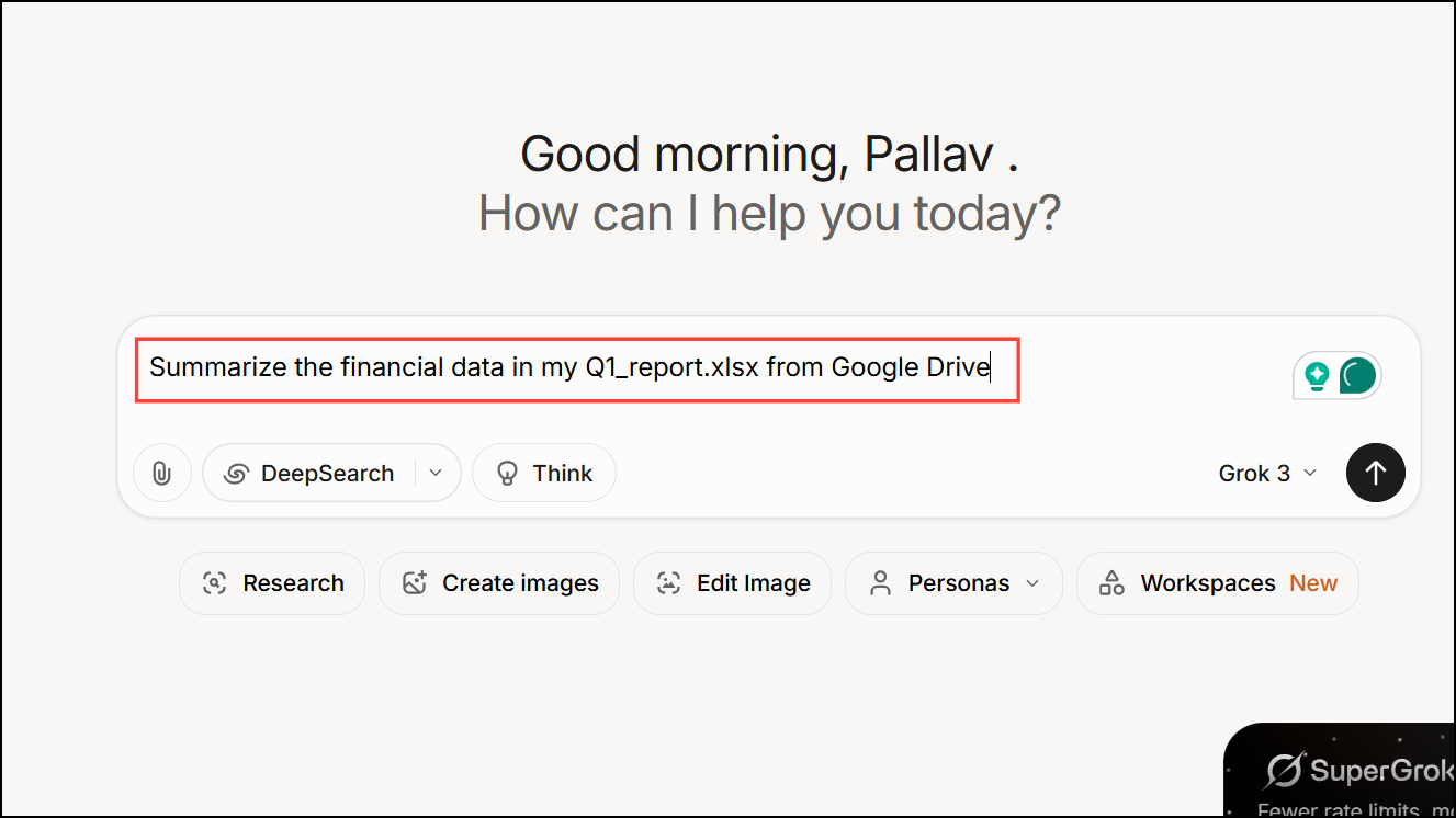 Step 2: Log in to your Grok account and start a new chat session. When you’re ready to work on a project, such as drafting a report, generating code, or analyzing a spreadsheet, enter your prompt in the main chat window. For example, you might type: Summarize the financial data in my Q1_report.xlsx from Google Drive or Create a presentation using the slides from my Drive.