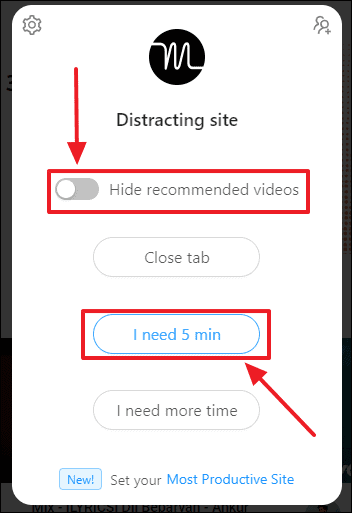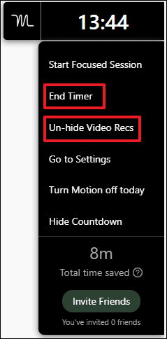 When you visit a website listed as unproductive, Motion doesn't block it outright. Instead, it provides tools to help you manage your time on the site. For example, if you navigate to YouTube, Motion allows you to set a time limit for your session and offers the option to hide recommended videos to reduce temptation.