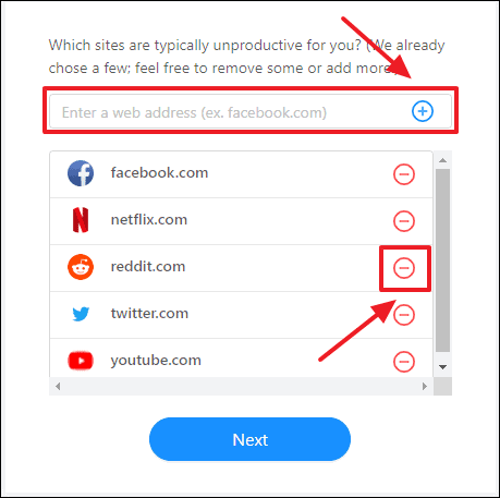 Next, you'll see the 'Personalize Motion' screen, which includes a pre-configured list of commonly distracting websites like Facebook, Twitter, and YouTube.