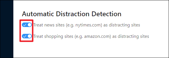 News and shopping websites can be sneaky time-wasters. Instead of adding each site individually to your distracting sites list, Motion offers an option to automatically classify all news and shopping sites as distracting.