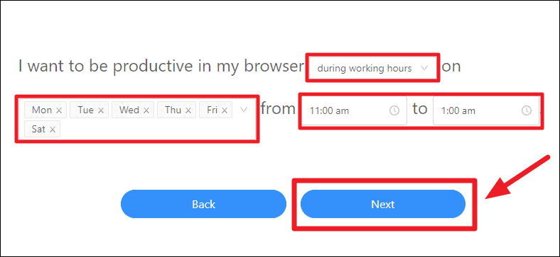 To have the extension active only during your work hours, select the default 'during work hours' option and adjust the days and times to match your schedule. This way, Motion helps you stay focused when you need to be productive and lets you browse freely after work.