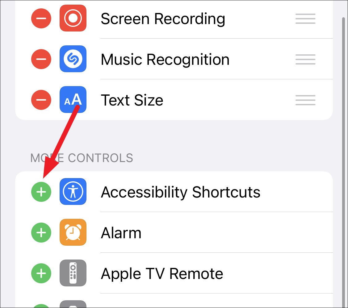 Scroll down to ‘More Controls’ and tap the ‘+’ next to ‘Accessibility Shortcuts’ to add it to the Control Center.