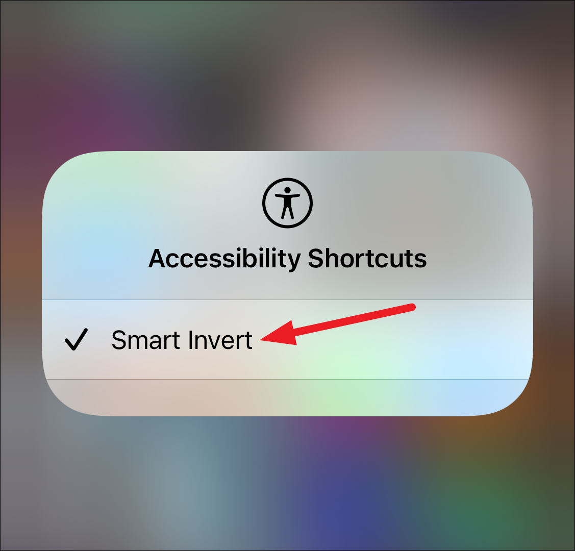Tap ‘Smart Invert’ or ‘Classic Invert’ to select it as your accessibility shortcut.