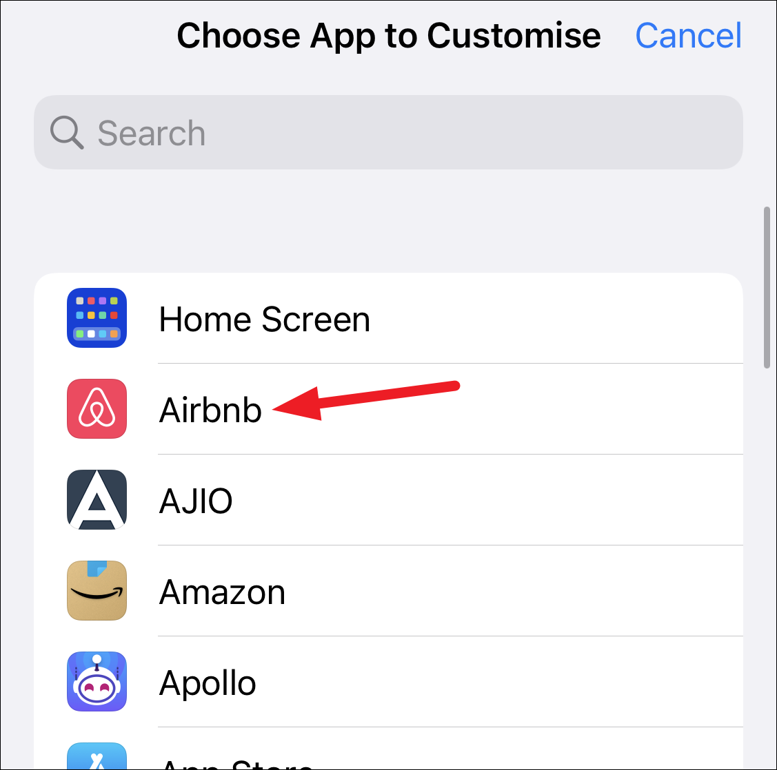 A list of all your apps will open. Find the app you want to add by either scrolling or searching the list. Then, tap the app to add it.