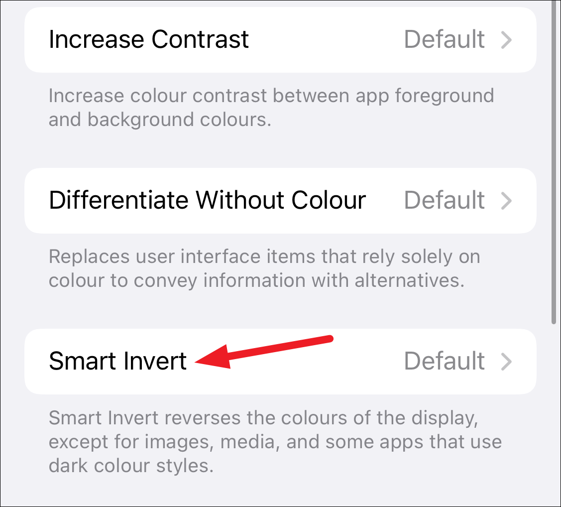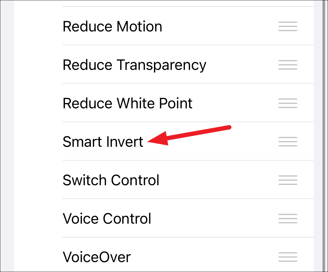 The available accessibility settings that you can customize will open. Tap the option for ‘Smart Invert’. Default is its preset value.