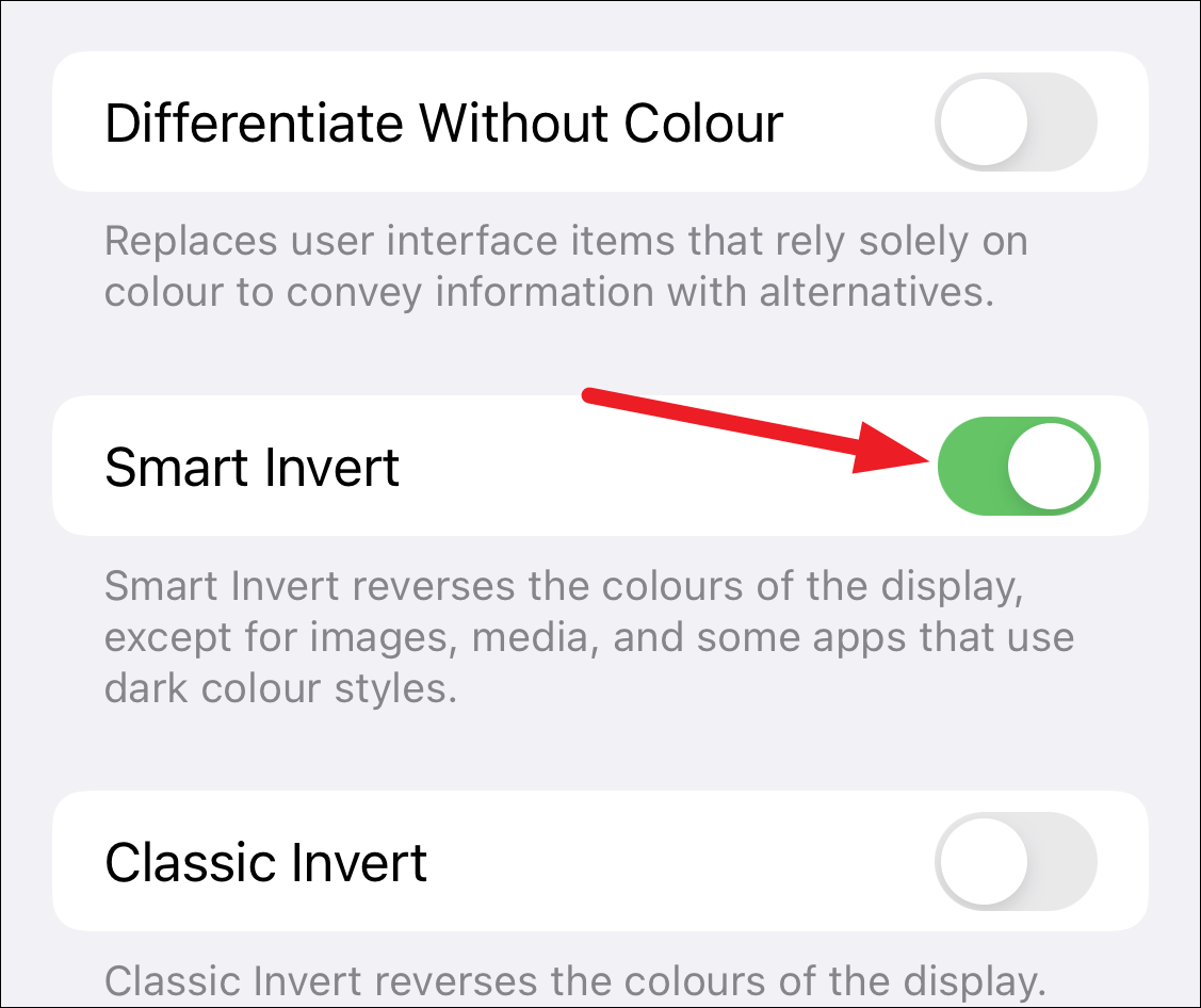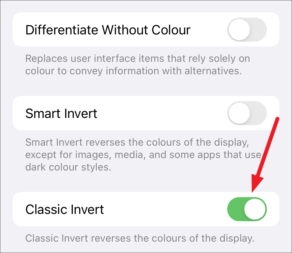 To use Classic Invert instead, skip to the next option and turn on the toggle for ‘Classic Invert’.