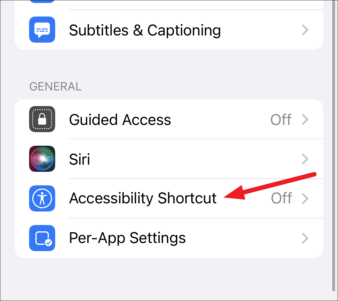Go to ‘Accessibility’ from the settings. Then, scroll down and tap the option for ‘Accessibility Shortcut’.