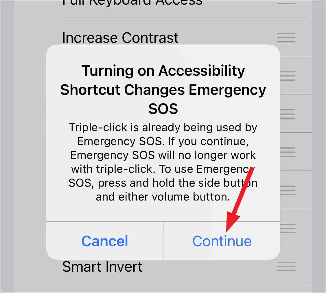 If you have SOS calls configured with a triple-click, enabling this will turn it off. Tap ‘Continue’ to proceed.