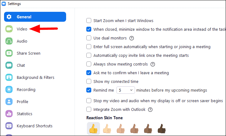 In the ‘Settings’ screen, you will find various tabs on the left and the corresponding settings on the right when you select a specific tab. Since we want to change the mirrored video settings, head to the ‘Video’ tab on the left.