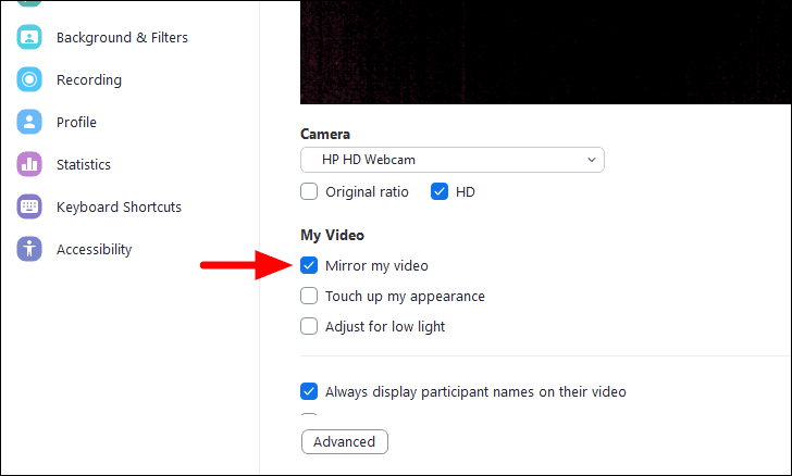 Next, untick the checkbox before ‘Mirror my video’ under ‘My Video’ settings.