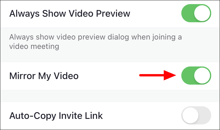 Next, locate the ‘Mirror my video’ option and tap on the toggle next to it to disable the setting.