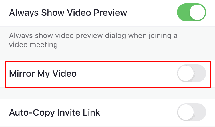 Once the setting is disabled, you will not find a tick on the checkbox. Also, the video will not be mirrored anymore when you are in a meeting.