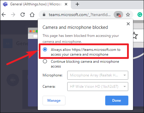 Step 5: Your browser will prompt you to allow Teams to use your microphone and camera. Click 'Allow' to grant permission. If you miss the prompt, click on the 'camera icon with a cross' in the address bar to adjust your settings.