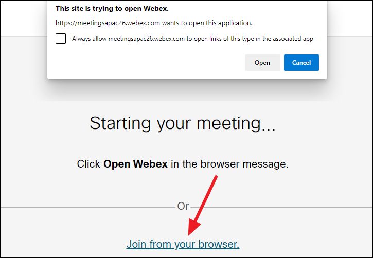 When joining a meeting from a browser, you can either join from the web app, the Webex site or you can even join without an account.