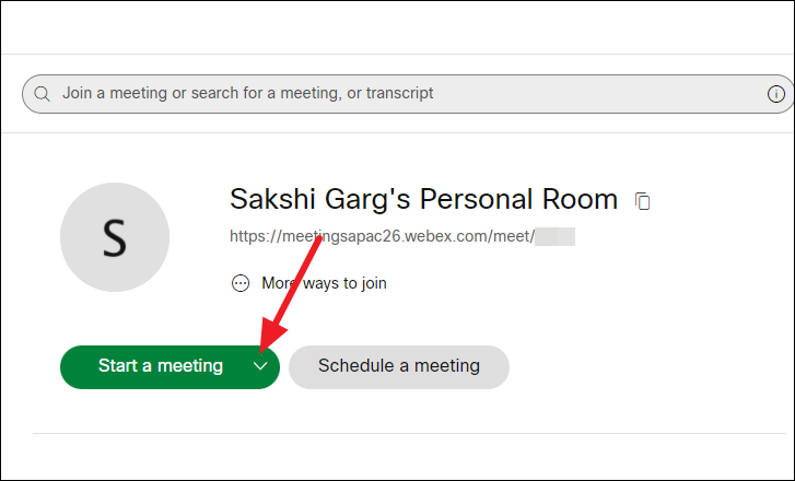 Finally, click the ‘Start a meeting’ option to host a meeting. The meeting will start in your personal room.