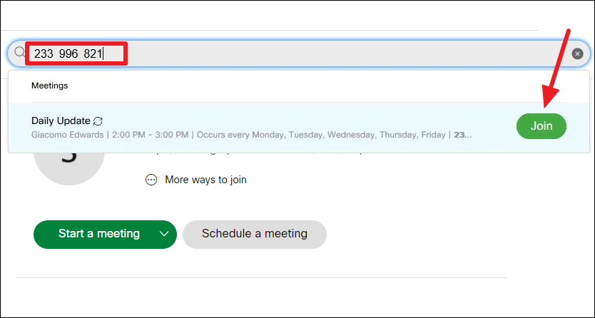 To join another meeting, go to the search bar at the top. You can then search for the meeting using the host’s name, their personal room link or ID, meeting title, or the meeting number. If the meeting exists, it’ll appear in the results underneath the search bar. Click the ‘Join’ button.
