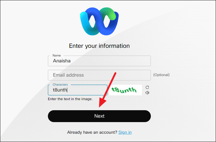 Enter your name, email address (optional), captcha, and click ‘Next’. Since you will not be logged in, your name will be how the meeting host will recognize you. So, enter your name correctly so they’ll admit you to the meeting. When you join as a guest, i.e., without signing in, you won’t have access to the full list of meeting features that authenticated users get.