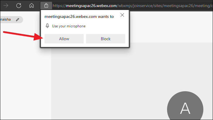 The screen to join the meeting will open. Your browser will display a permission prompt that Webex wants to access your microphone and camera. Click ‘Allow’ to provide the permission.