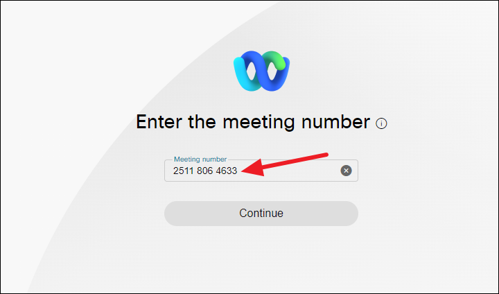 Then, enter the meeting number in the textbox and click ‘Continue’.