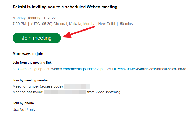 If you’ve received the meeting, webinar, event, or training session invite via email, you can easily join the meeting. Open the email with the invitation. The meeting invite will have a ‘Join meeting’ option; click it.