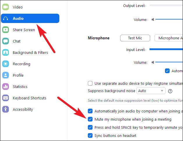 Now go to ‘Audio’ settings and check the box for ‘Mute my microphone when joining a meeting’.
