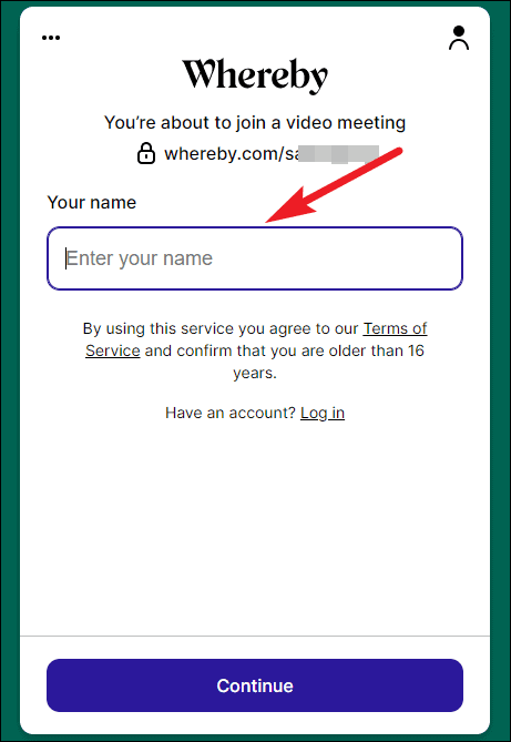 This method of joining a room can also be used by users who do not have a Whereby account. By using the direct link, you won’t be asked to create an account to join a meeting in Whereby. Instead, it’ll ask for your name.