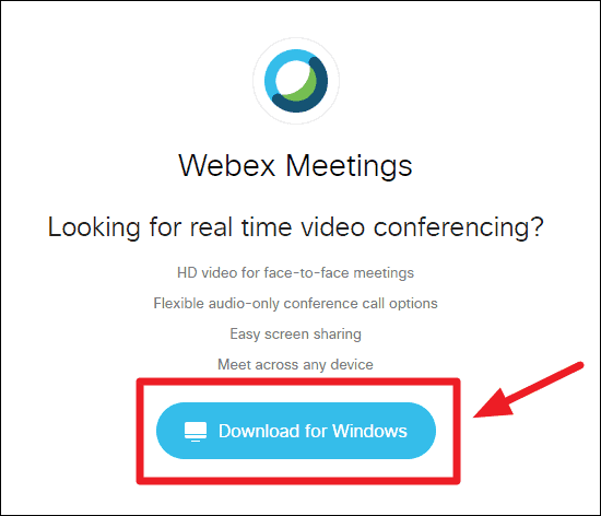 The WebEx Meetings application is available for both Windows and Mac computers. To download it, open webex.com/downloads in your browser and click on the 'Download for Windows' button under the WebEx Meetings section.