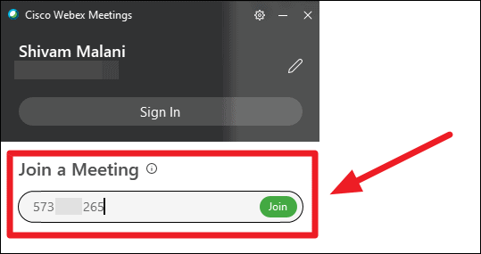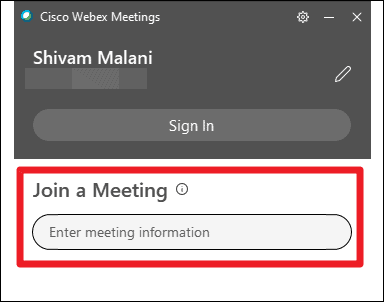 Once the WebEx app dashboard opens, navigate to the 'Join a meeting' section. In the 'Enter meeting information' field, input the meeting code or the meeting link that you've received.