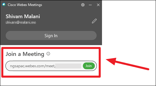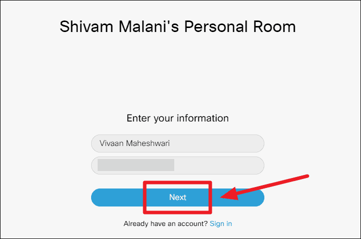 If you have a WebEx account, you can use the 'Sign in' link or one of the SSO sign-in options to log in. If you don't, simply enter your 'Full name' and 'Email address' in the respective fields, and then click on the 'Next' button to join the meeting as a guest.