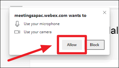The WebEx meeting preview screen will appear, prompting you for permission to use your 'Microphone' and 'Camera'. Make sure to click on the 'Allow' button to enable these features for the meeting.