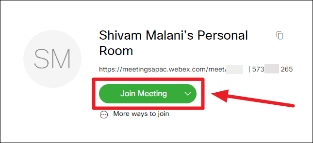 A meeting information screen will appear, displaying the name of the meeting room, as well as the meeting link and meeting number you're about to join. Click on the 'Join Meeting' button to proceed.