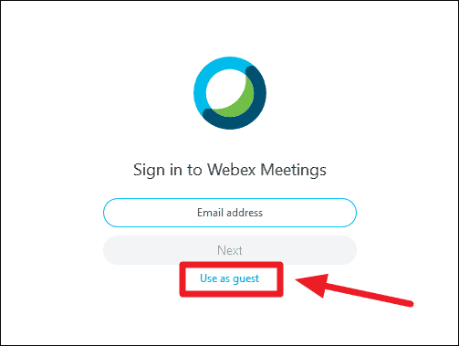 When the WebEx app opens, you'll see the sign-in screen. If you have a WebEx account, enter your credentials to sign in. If you don't, and need to join a meeting promptly, click on the 'Use as guest' link to proceed without an account.