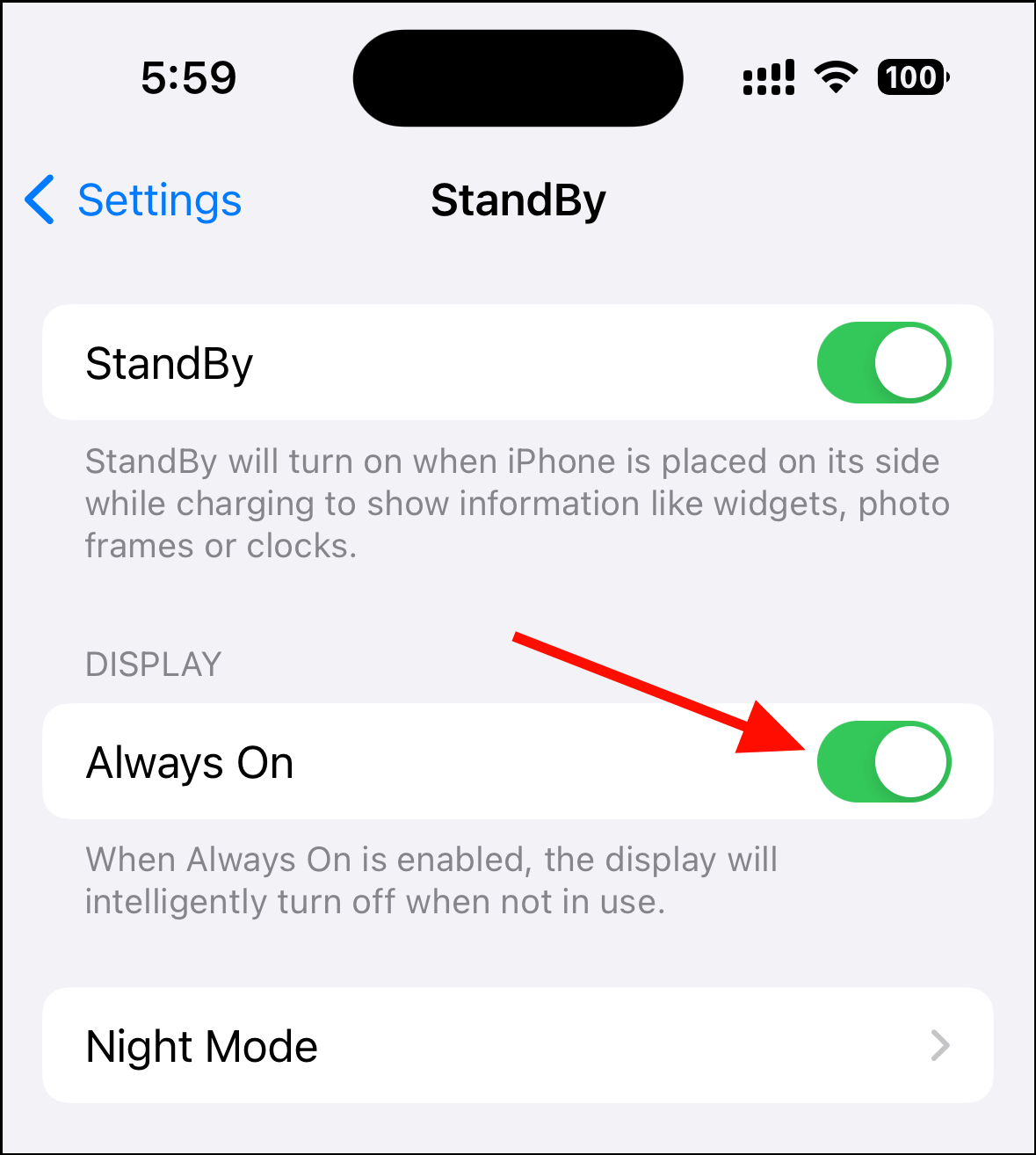 Once in StandBy settings, look for the 'Always On' feature and turn on the toggle switch next to it.
