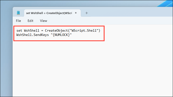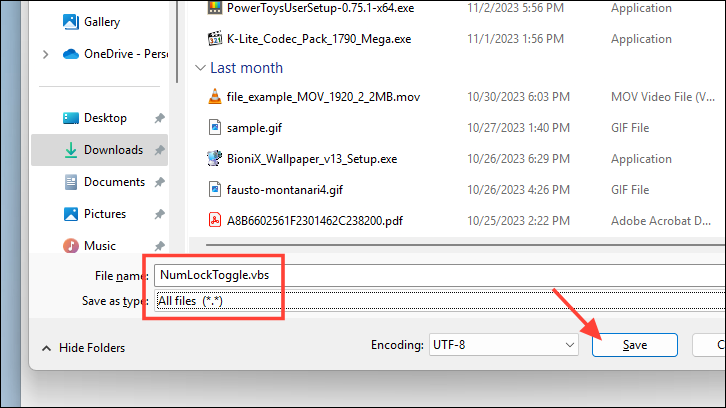 - Name the file (e.g., EnableNumLock.vbs), set Save as type to All Files, and click Save.