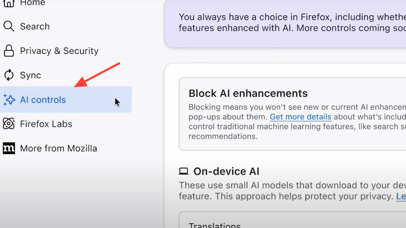 - Check Settings → AI Controls (if on Firefox 148+) — the Block AI enhancements toggle should reflect your choices, and individual features should show as blocked.