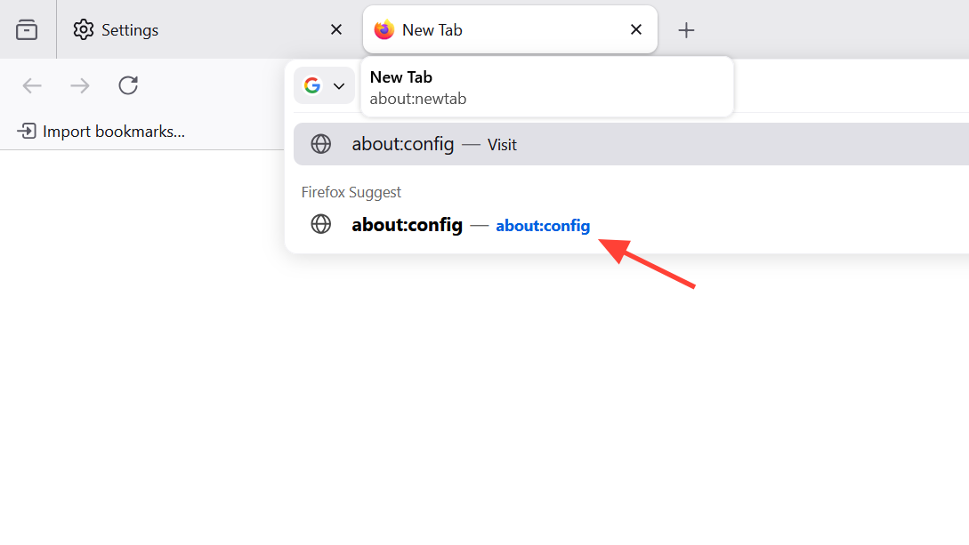 Step 1: Type about:config in the Firefox address bar and press Enter. Click "Accept the Risk and Continue" when the warning appears.