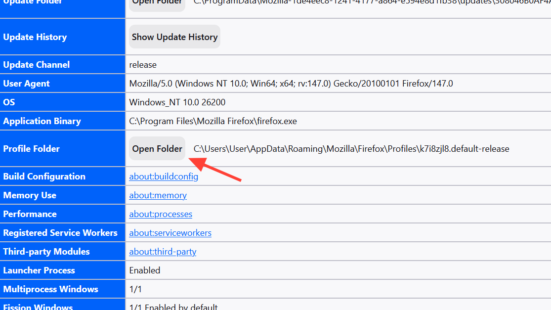 Step 1: Open your Firefox profile folder. Type about:support in the address bar, find the "Profile Folder" row, and click "Open Folder." On Windows, the path is typically C:\Users\[USERNAME]\AppData\Roaming\Mozilla\Firefox\Profiles\[PROFILENAME].
