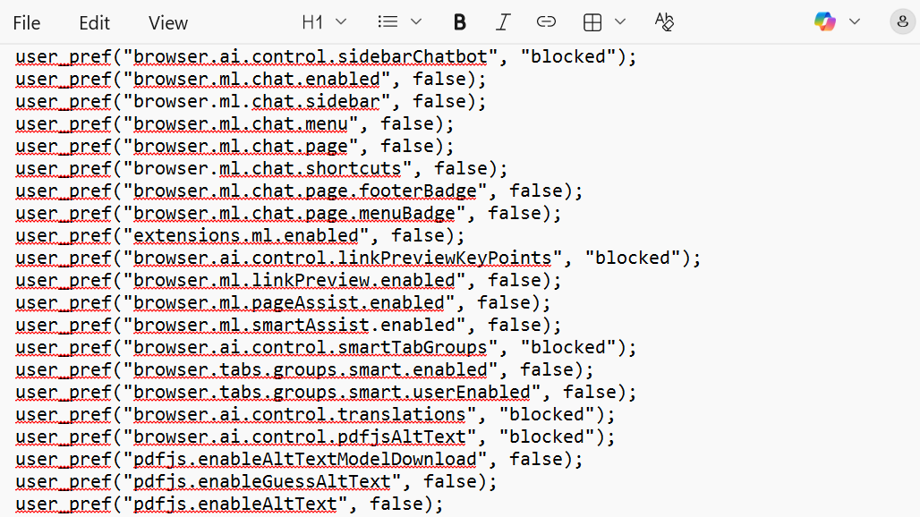.ml. in the about:config search box will surface most machine-learning-related preferences at once, making it easier to spot any new ones Mozilla adds in future updates.Option 3: Apply all preferences at once with a user.js file