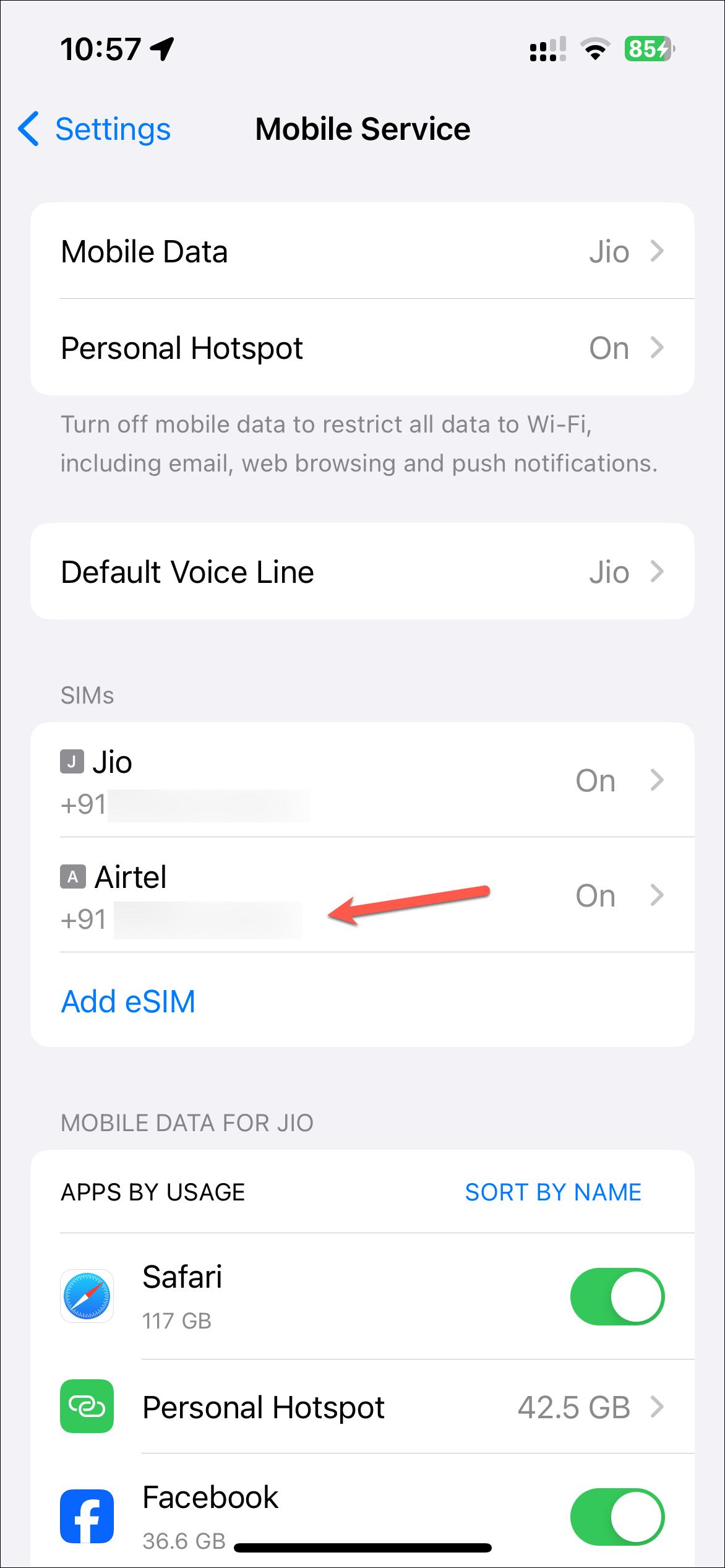 - You can see the phone number associated with each line underneath it. The format usually includes the country code, making it easy to identify if it's a local or international number. In case you can't, tap on the eSIM you want to see the phone number for.